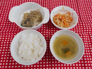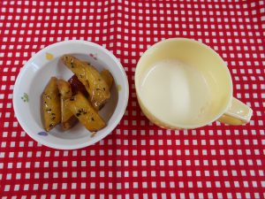 未満児さん10時のおやつ(牛乳、パイン缶) 昼食(さわらとごぼうの煮つけ、切干大根のごま和え、かぼちゃのみそ汁) おやつ(牛乳、大学芋)