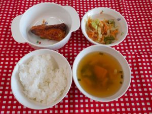 未満児さん10時のおやつ(牛乳、みかん缶) 昼食(ぶりのケチャップ和え、やさいのツナあえ、大根のすまし汁) おやつ(ミルク、お好み焼き)