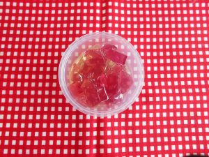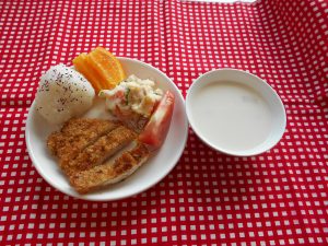 未満児さん10時のおやつ(牛乳、せんべい) 昼食(トンカツ、ポテトサラダ、コーンスープ、添:トマト、オレンジ) おやつ(あじさいゼリー)