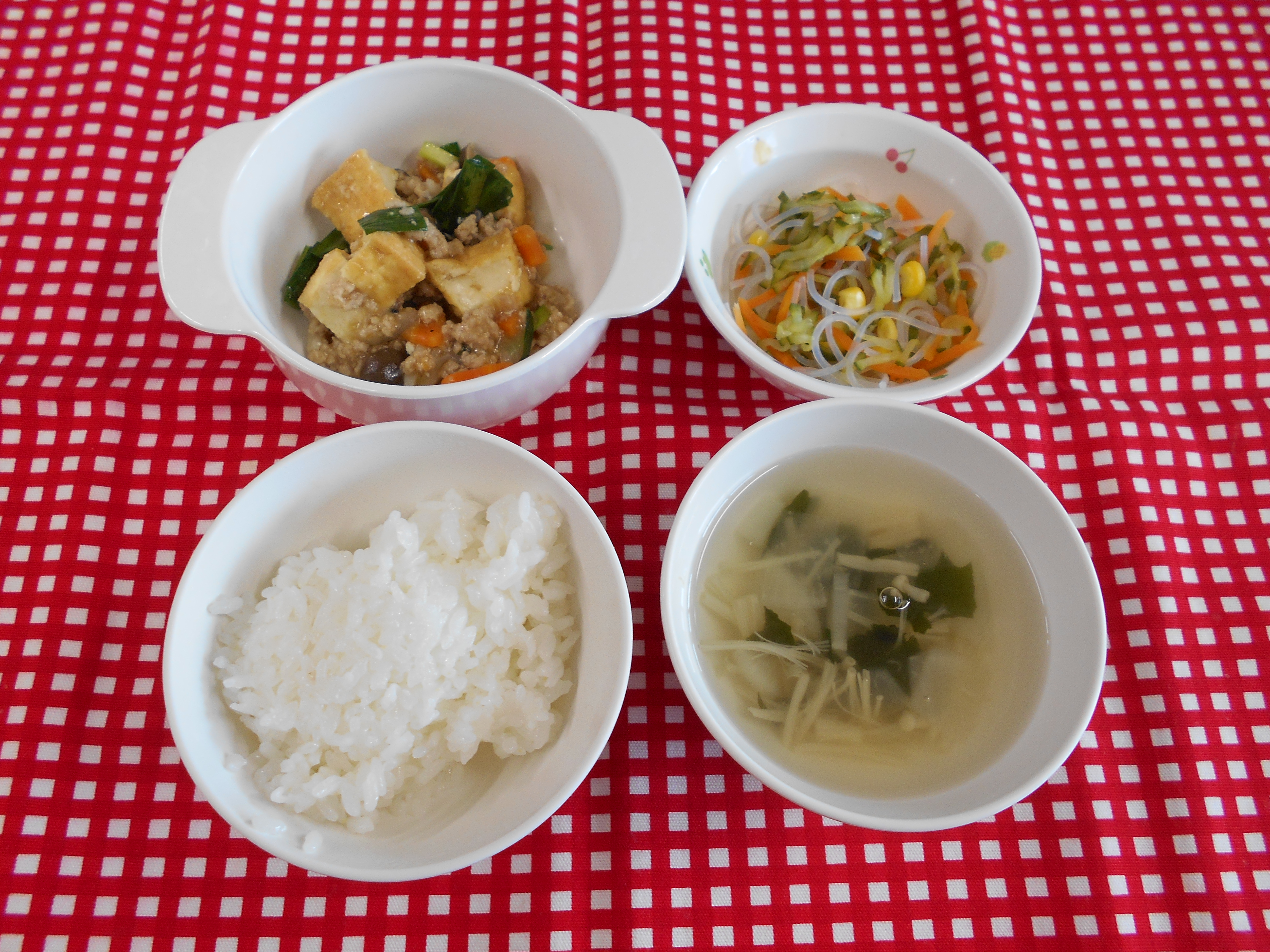 未満児さん10時のおやつ(牛乳、もも缶) 昼食(厚揚げの炒め物、はるさめの酢の物、中華スープ) おやつ(牛乳、おかし)