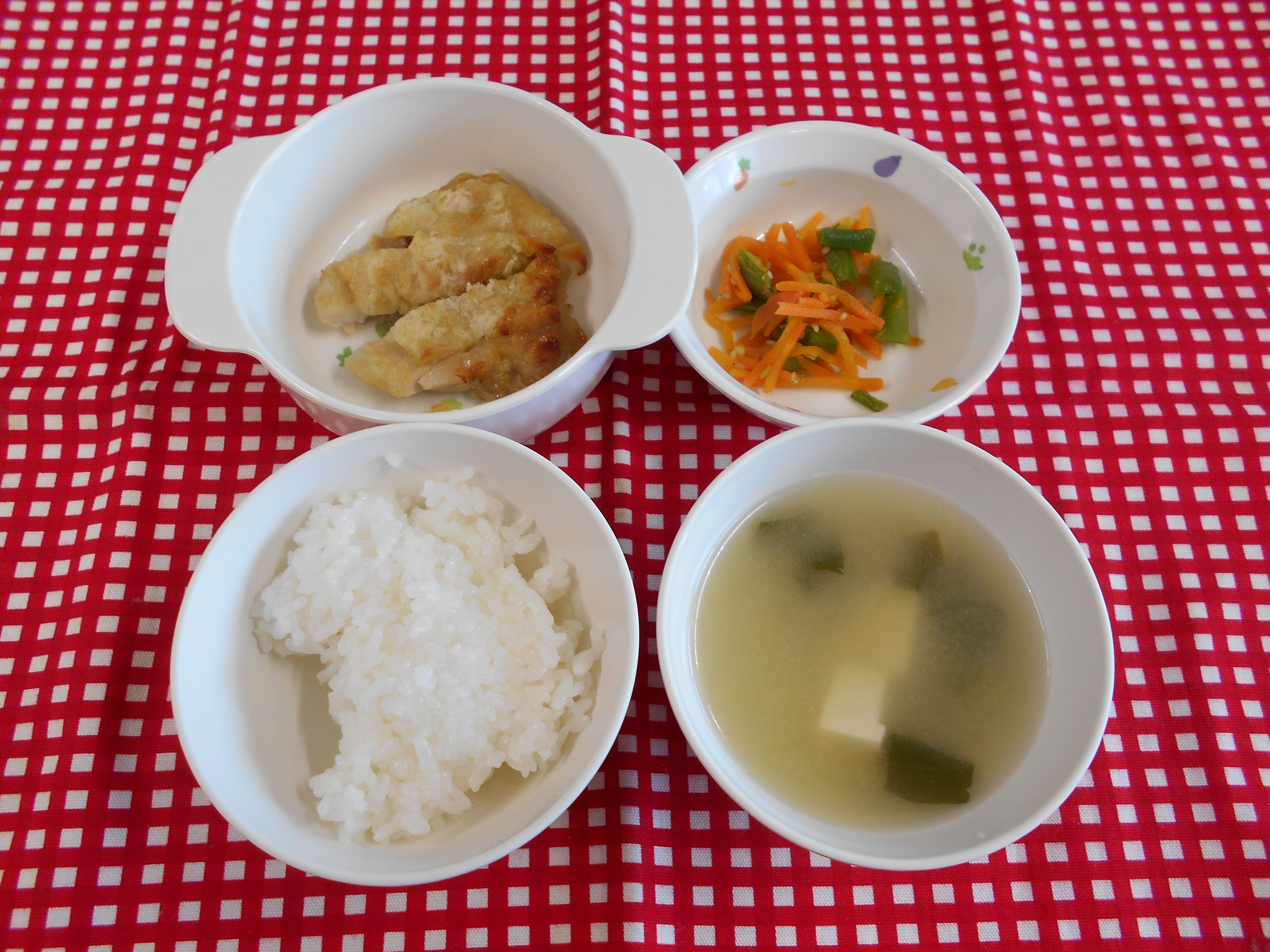 未満児さん10時のおやつ(牛乳、おかし) 昼食(ハニースパイシーチキン、いんげんのごま炒め、豆腐と小松菜のみそ汁) おやつ(牛乳、カステラ)