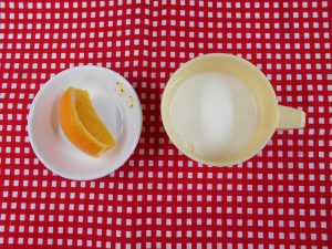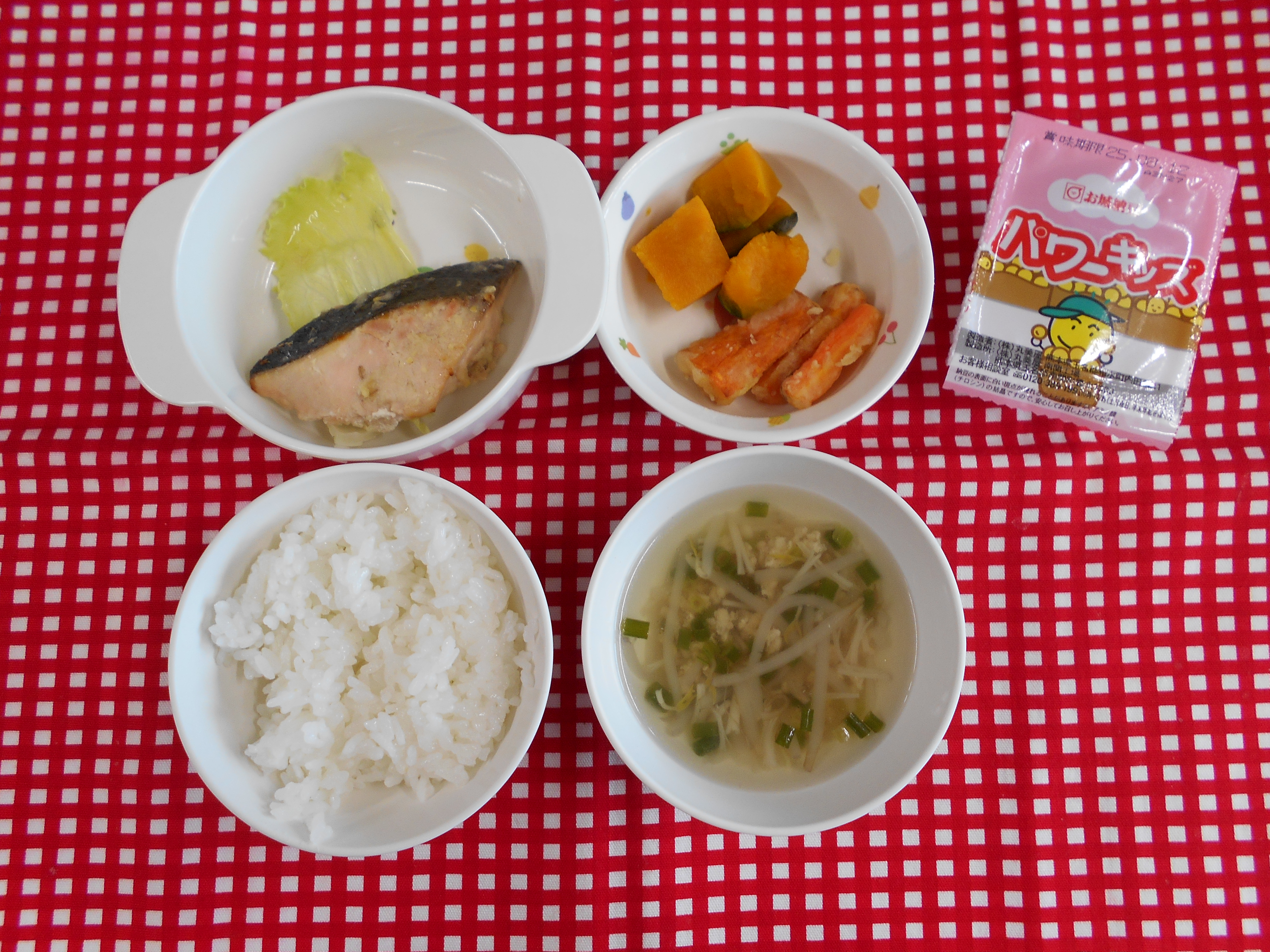 未満児さん10時のおやつ(牛乳、もも缶) 昼食(さけの香りみそ焼き、かぼちゃのだし浸し、フライドにんじん、鶏ときのこの汁、納豆) おやつ(ミルク、オレンジ)