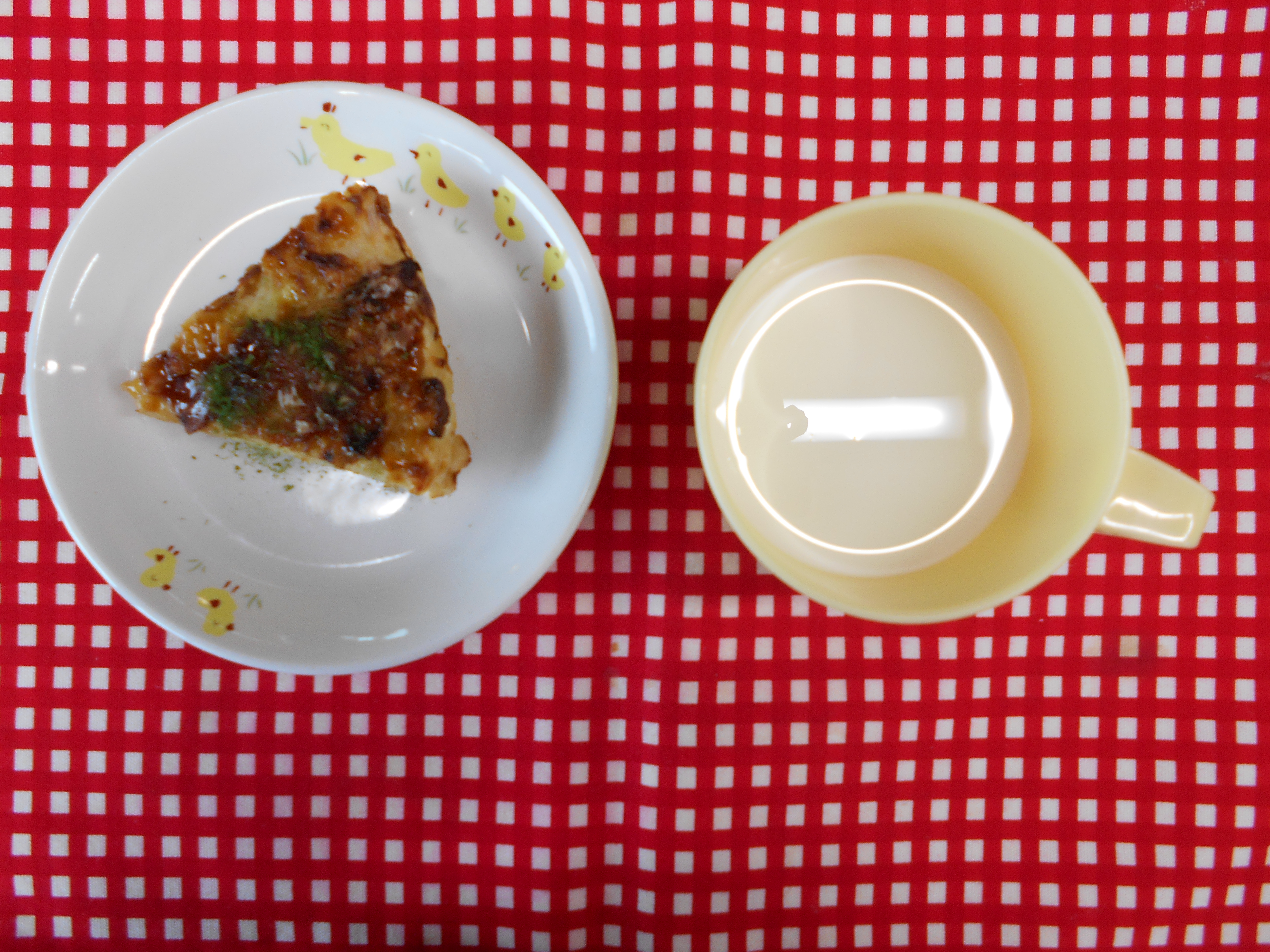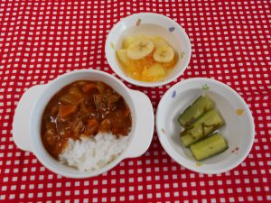 未満児さん10時のおやつ(牛乳、おかし) 昼食(ハヤシライス、きゅうりの昆布あえ、フルーツポンチ) おやつ(牛乳、お好み焼き)