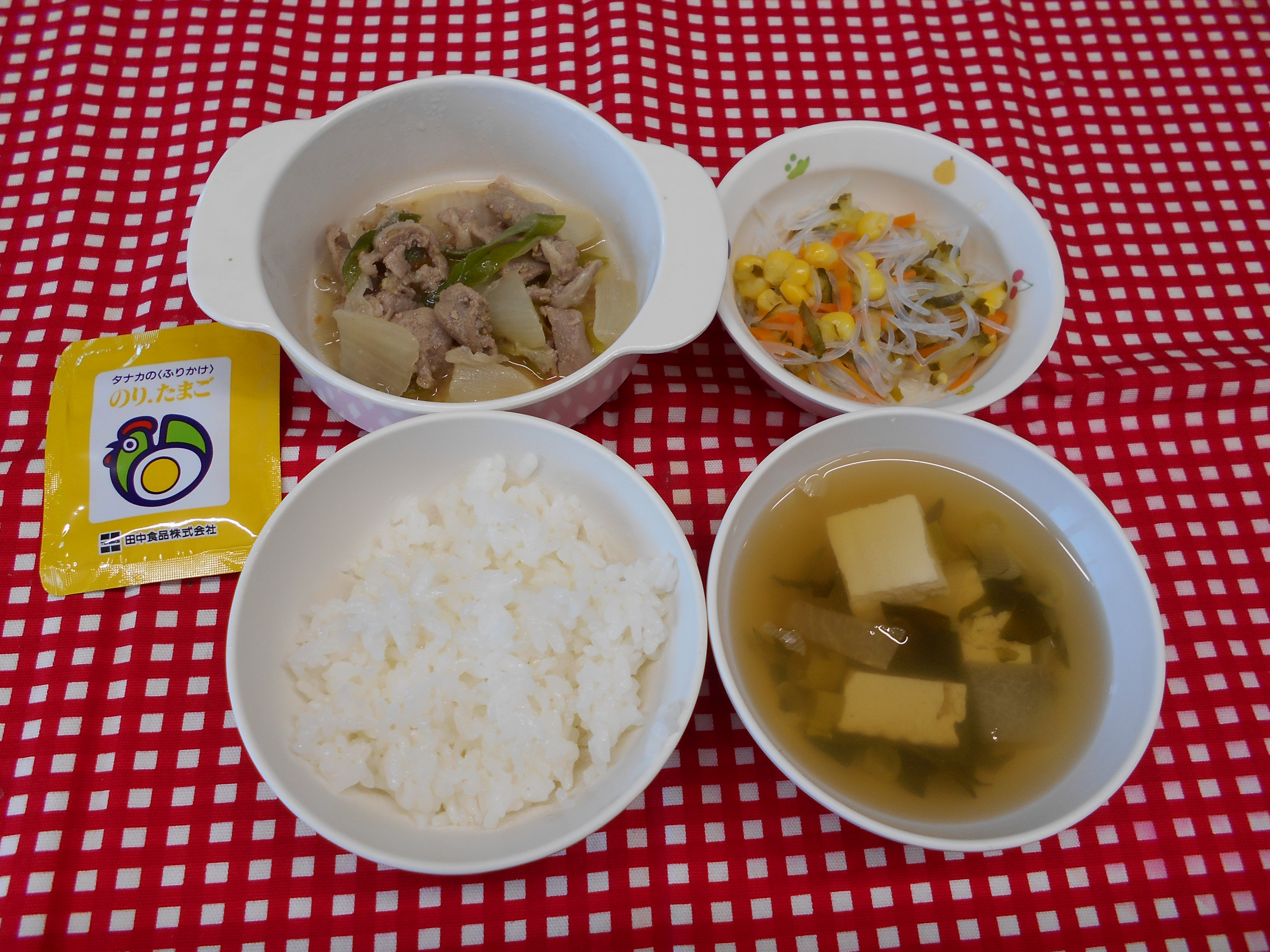 未満児さん10時のおやつ(牛乳、バナナ) 昼食(豚肉と野菜のごま炒め、はるさめの酢の物、とうがんのスープ、ふりかけ) おやつ(お茶、おにぎり、漬物)