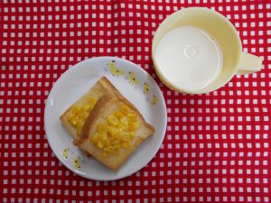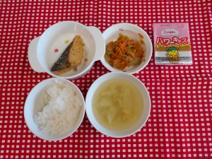 未満児さん10時のおやつ(牛乳、みかん缶) 昼食(鮭の西京焼き、きんぴらごぼう、キャベツのみそ汁、納豆) おやつ(牛乳、コーンマヨトースト)