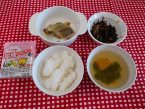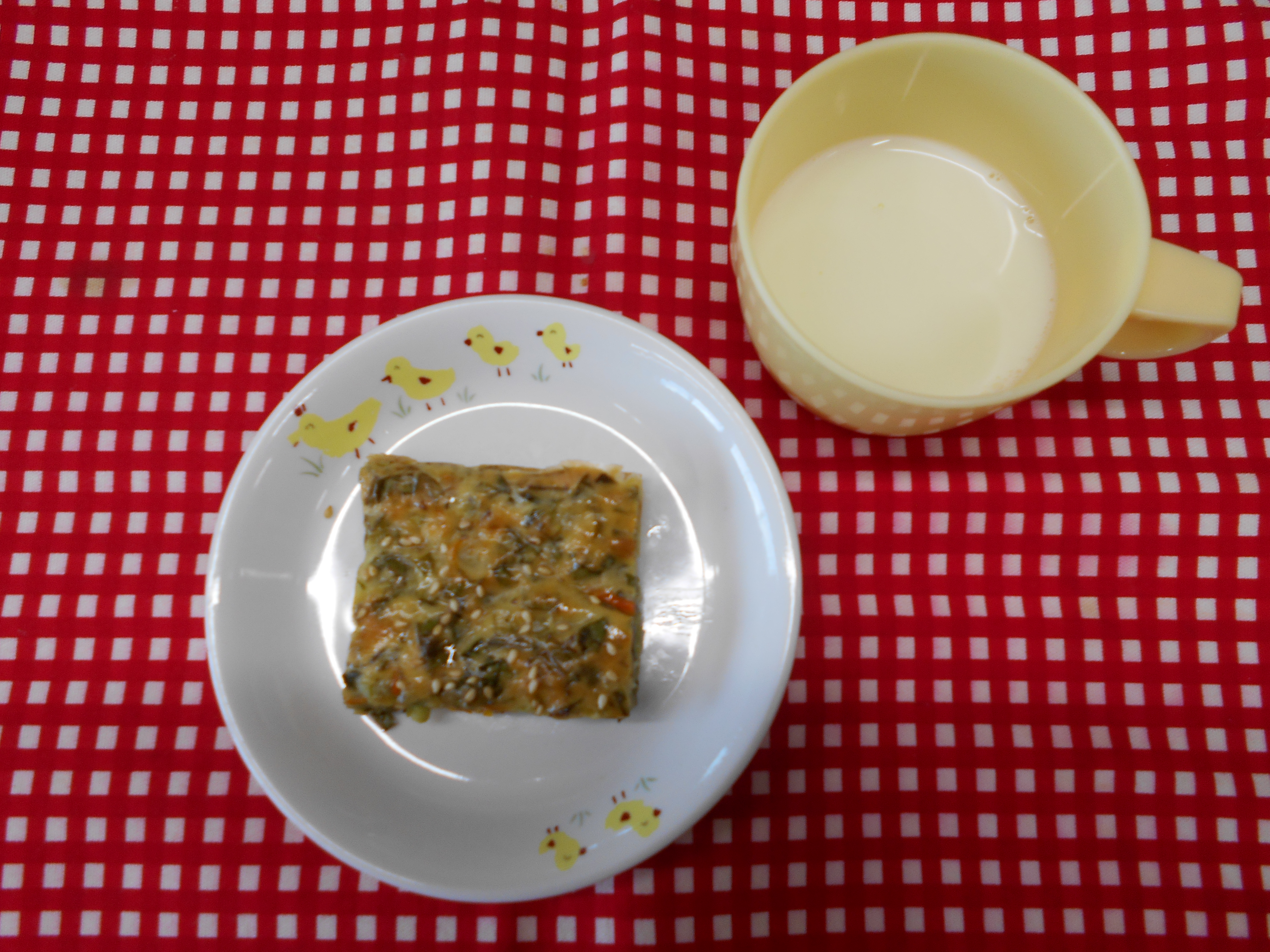 未満児さん10時のおやつ(牛乳、パイン缶) 昼食(たらの磯辺焼き、ひじきの煮物、チンゲン菜のすまし汁) おやつ(ミルク、チヂミ)