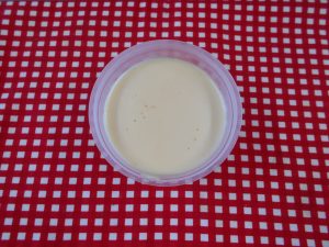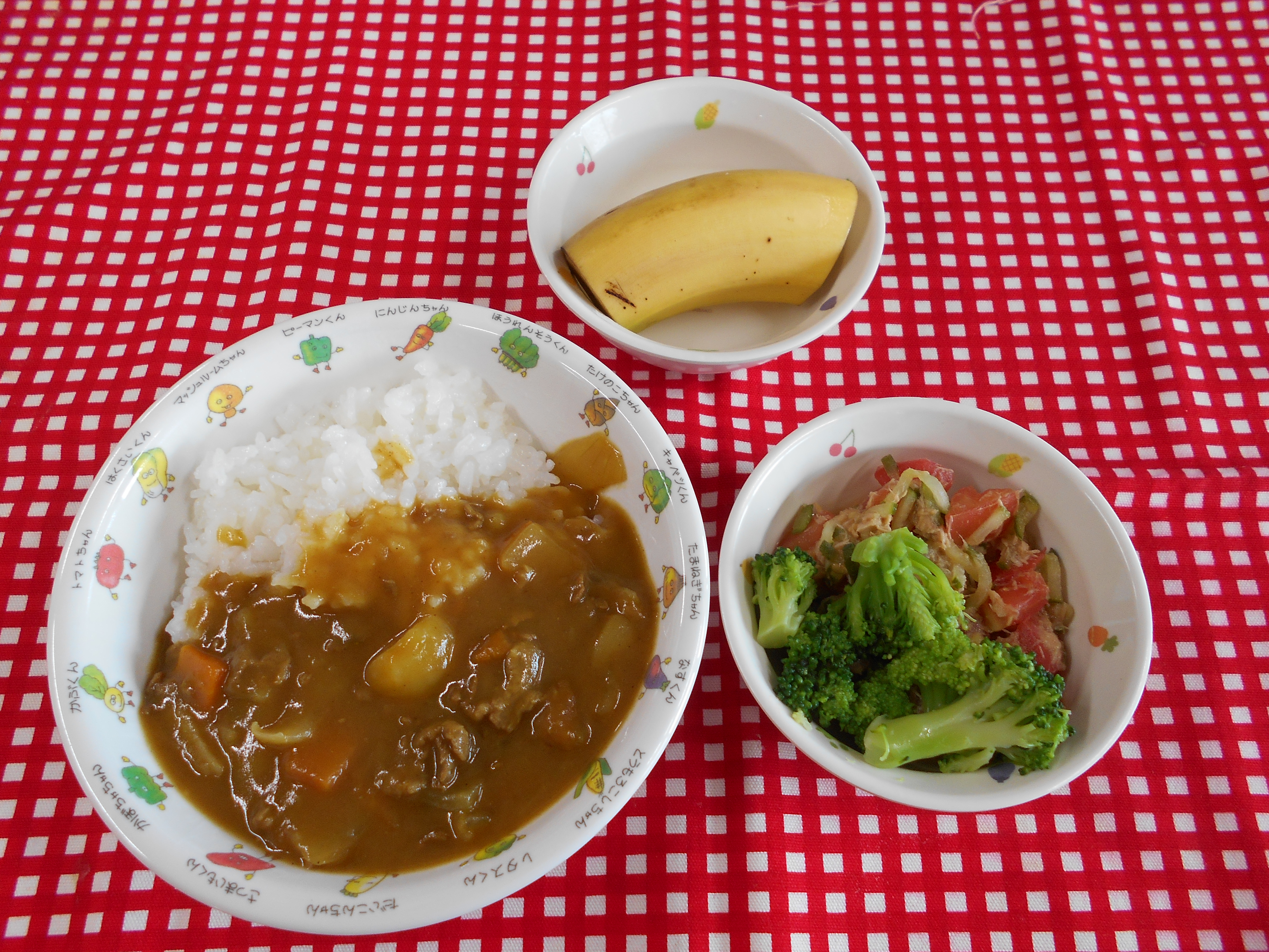 未満児さん10時のおやつ(牛乳、もも缶) 昼食(ビーフカレー、トマトのツナ和え、ゆでブロッコリー、バナナ) おやつ(プリン)