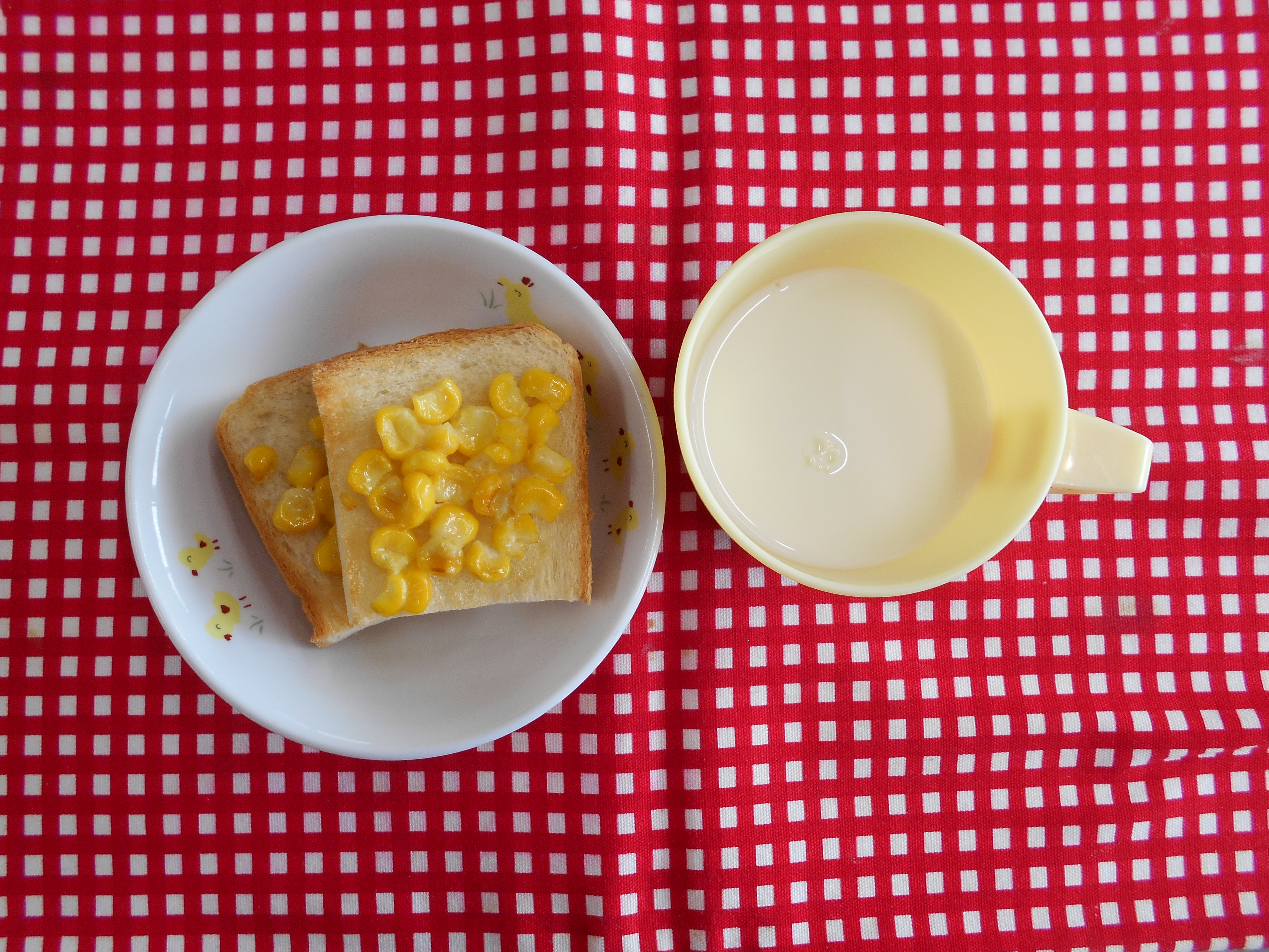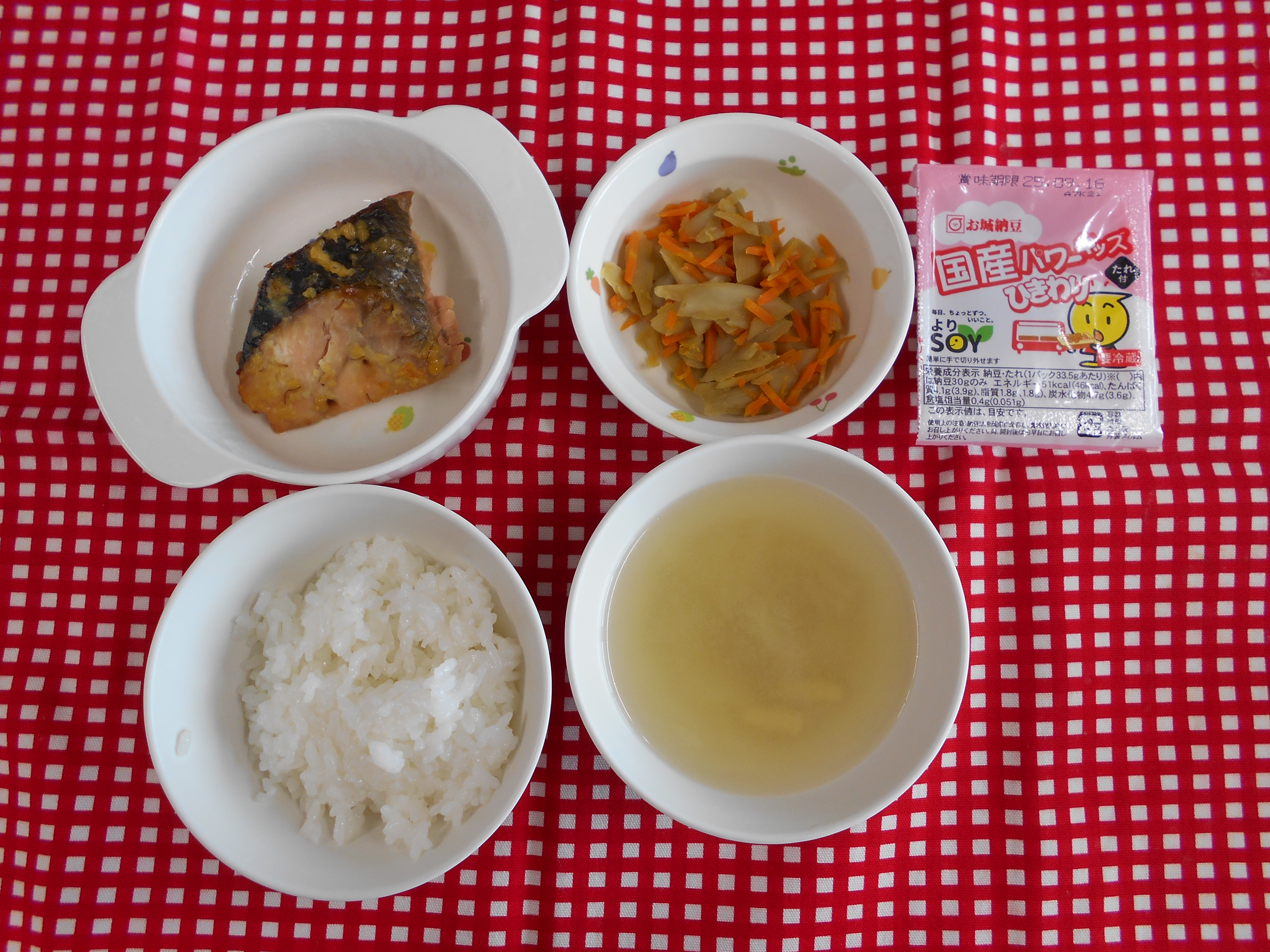 未満児さん10時のおやつ(牛乳、パイン缶) 昼食(さけの西京焼き、きんぴらごぼう、キャベツのみそ汁、納豆) おやつ(牛乳、コーンマヨトースト)