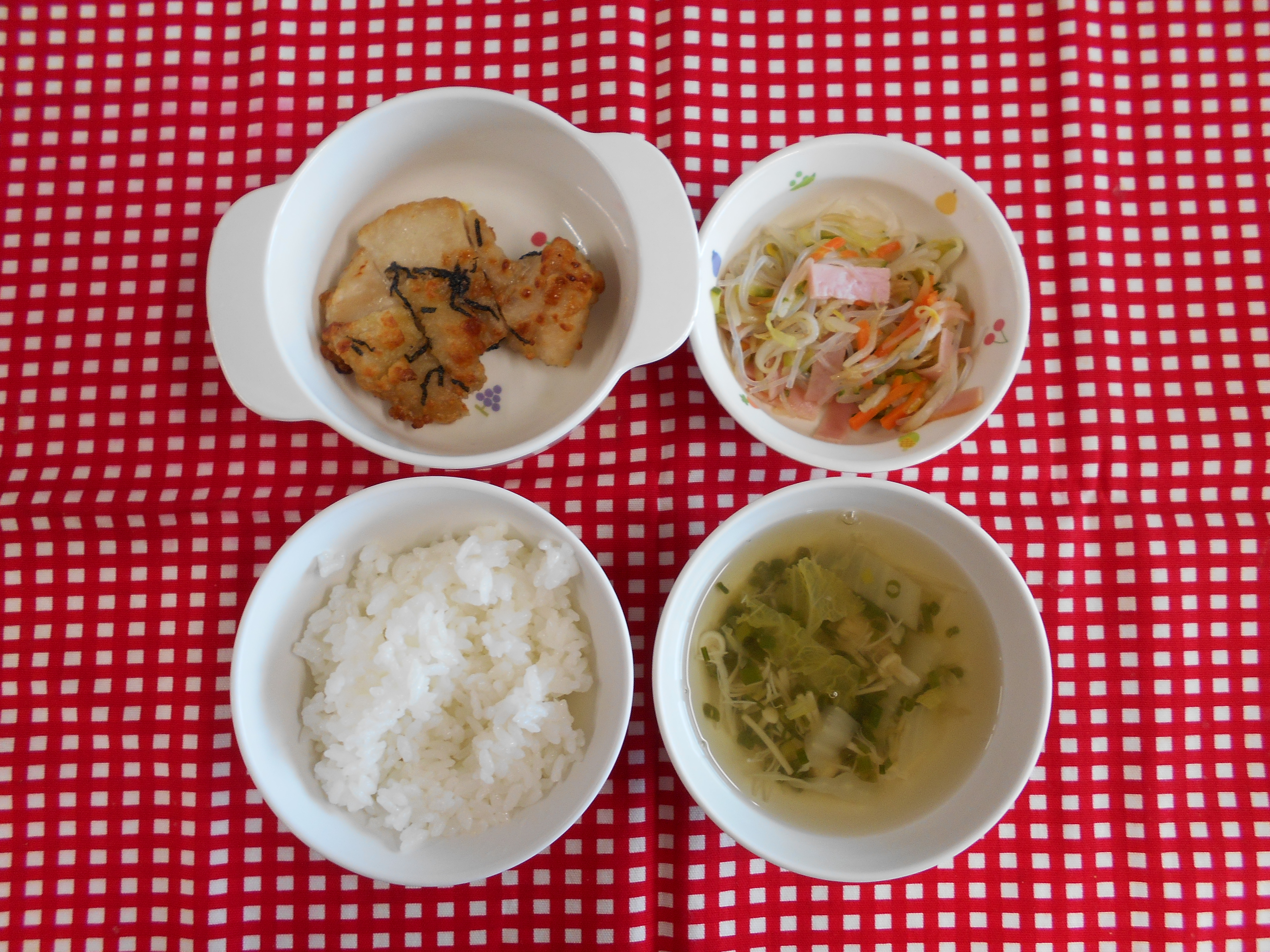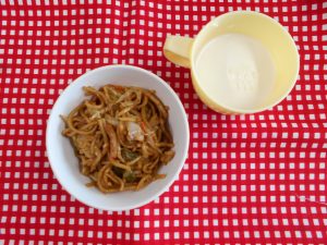 未満児さん10時のおやつ(牛乳、パイン缶) 昼食(鶏の海苔焼き、きゅうりの中華風サラダ、白菜とえのきのすまし汁) おやつ(牛乳、焼きそば)
