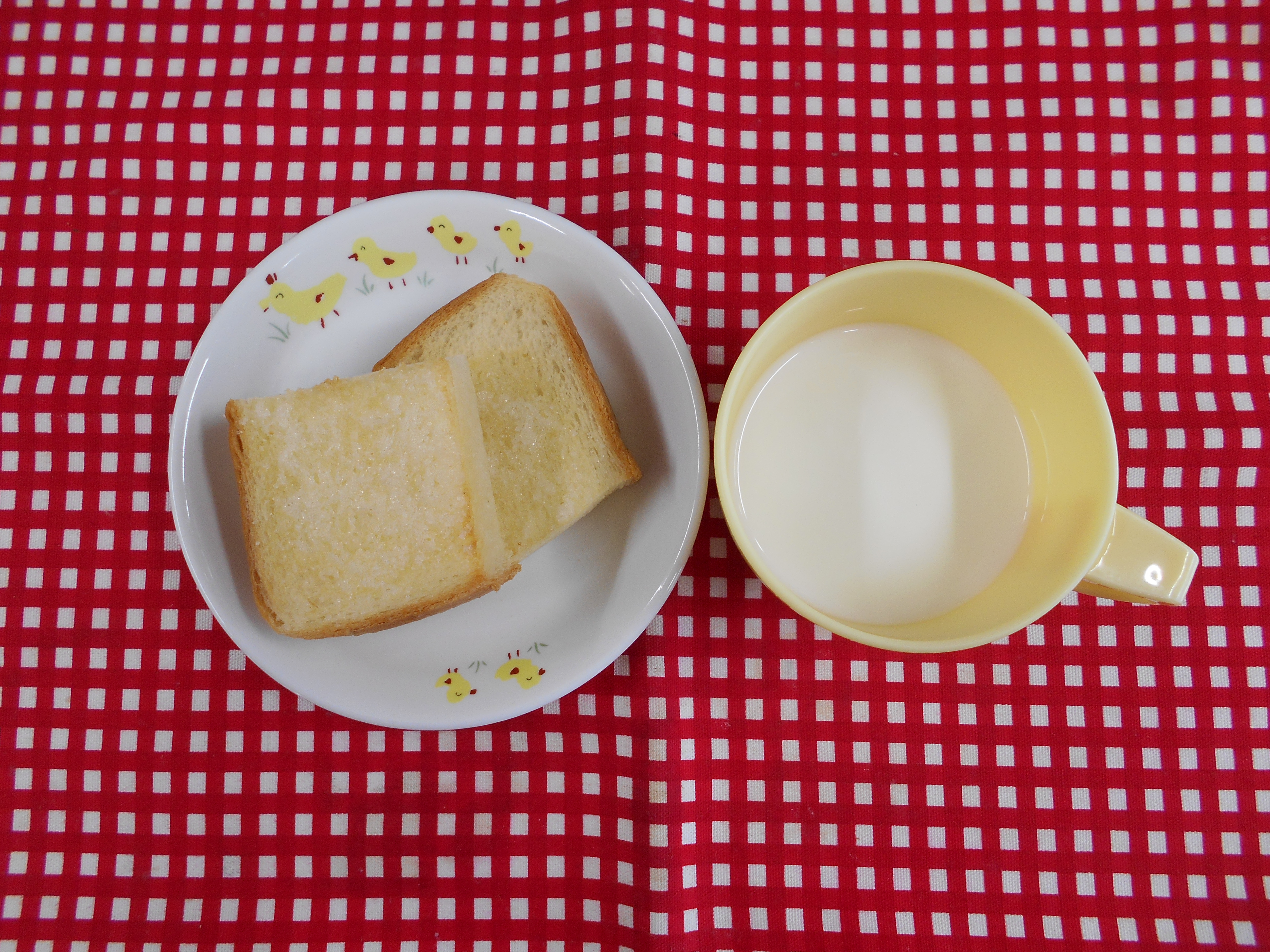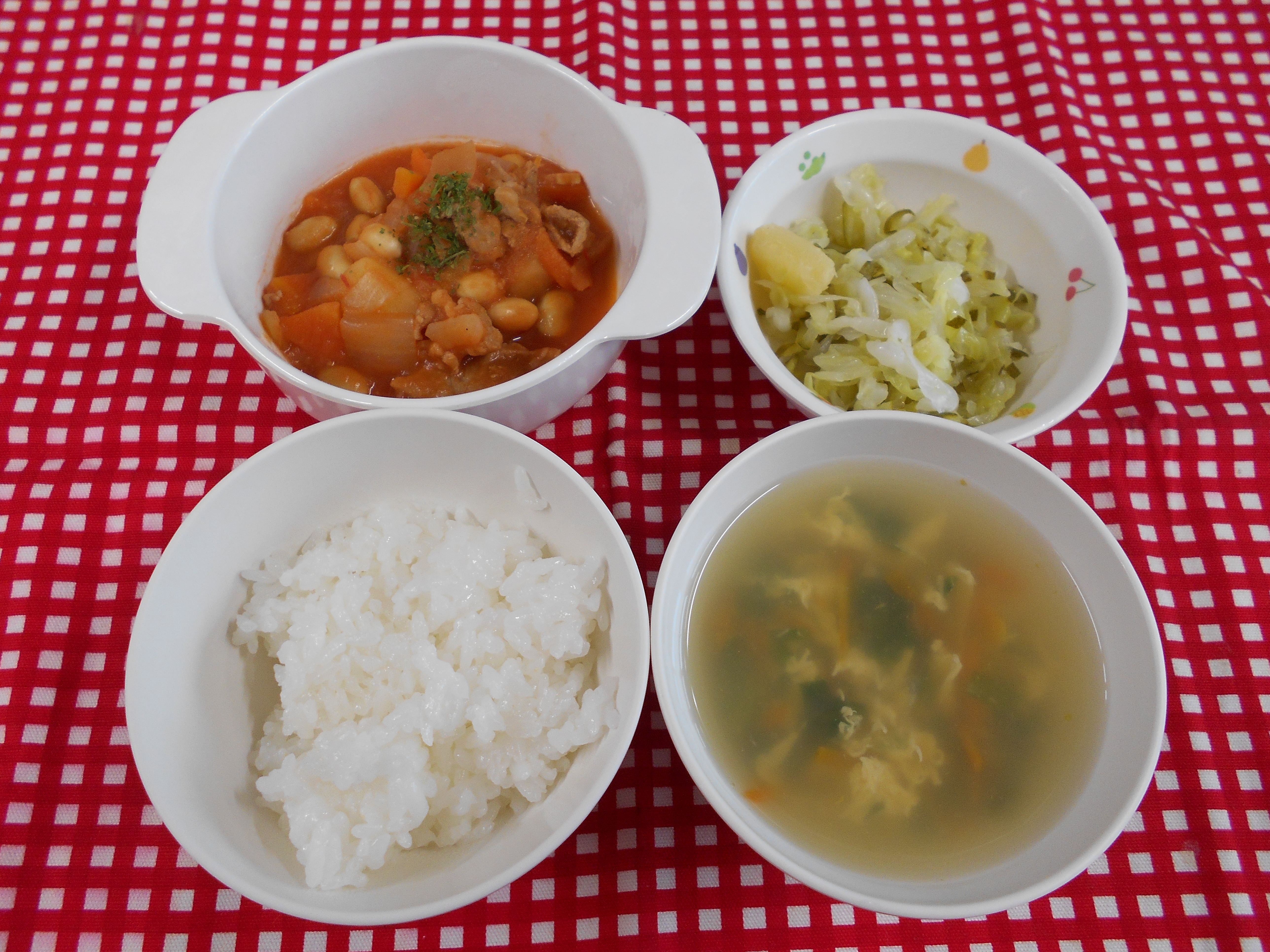 未満児さん10時のおやつ(牛乳、せんべい) 昼食(ポークビーンズ、キャベツのパインサラダ、たまごスープ) おやつ(牛乳、シュガートースト)