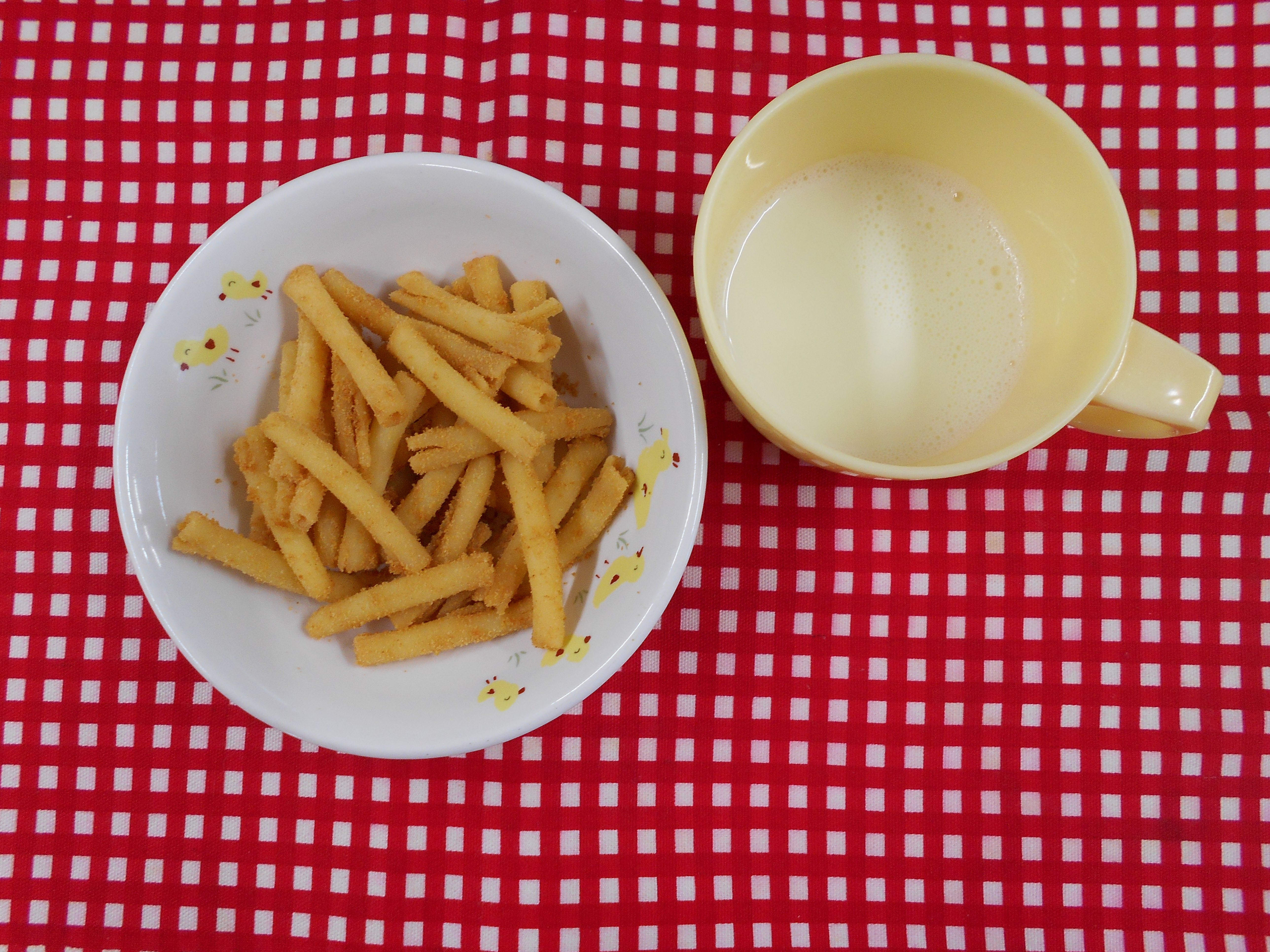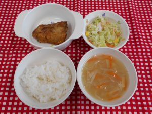 未満児さん10時のおやつ(牛乳、もも缶) 昼食(ぶりの竜田揚げ、コールスローサラダ、切干大根のみそ汁) おやつ(ミルク、マカロニきな粉)
