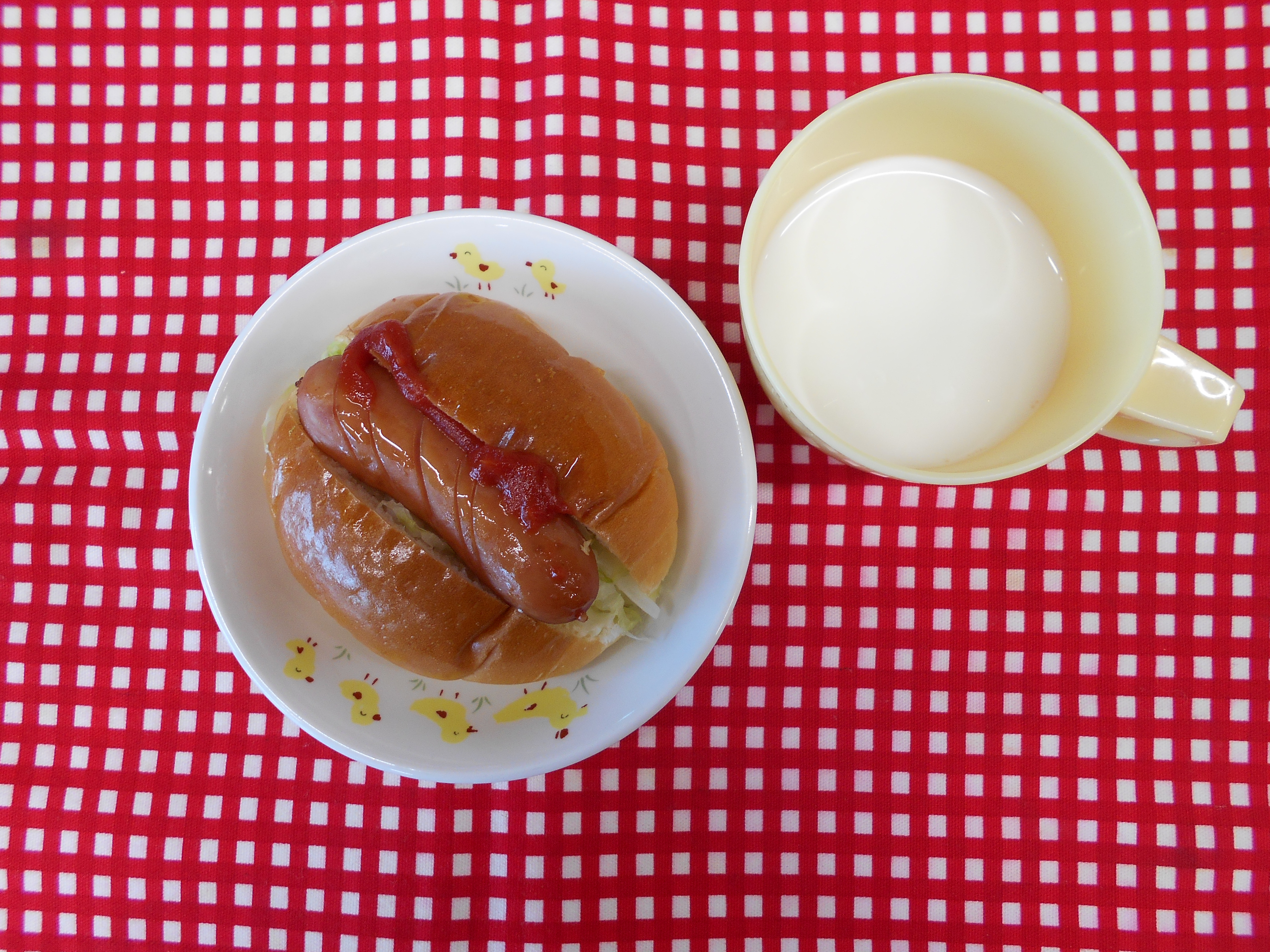 未満児さん10時のおやつ(牛乳、バナナ) 昼食(さわらと人参の煮物、小松菜のごま和え、里芋のみそ汁、納豆) おやつ(牛乳、ホットドッグ)