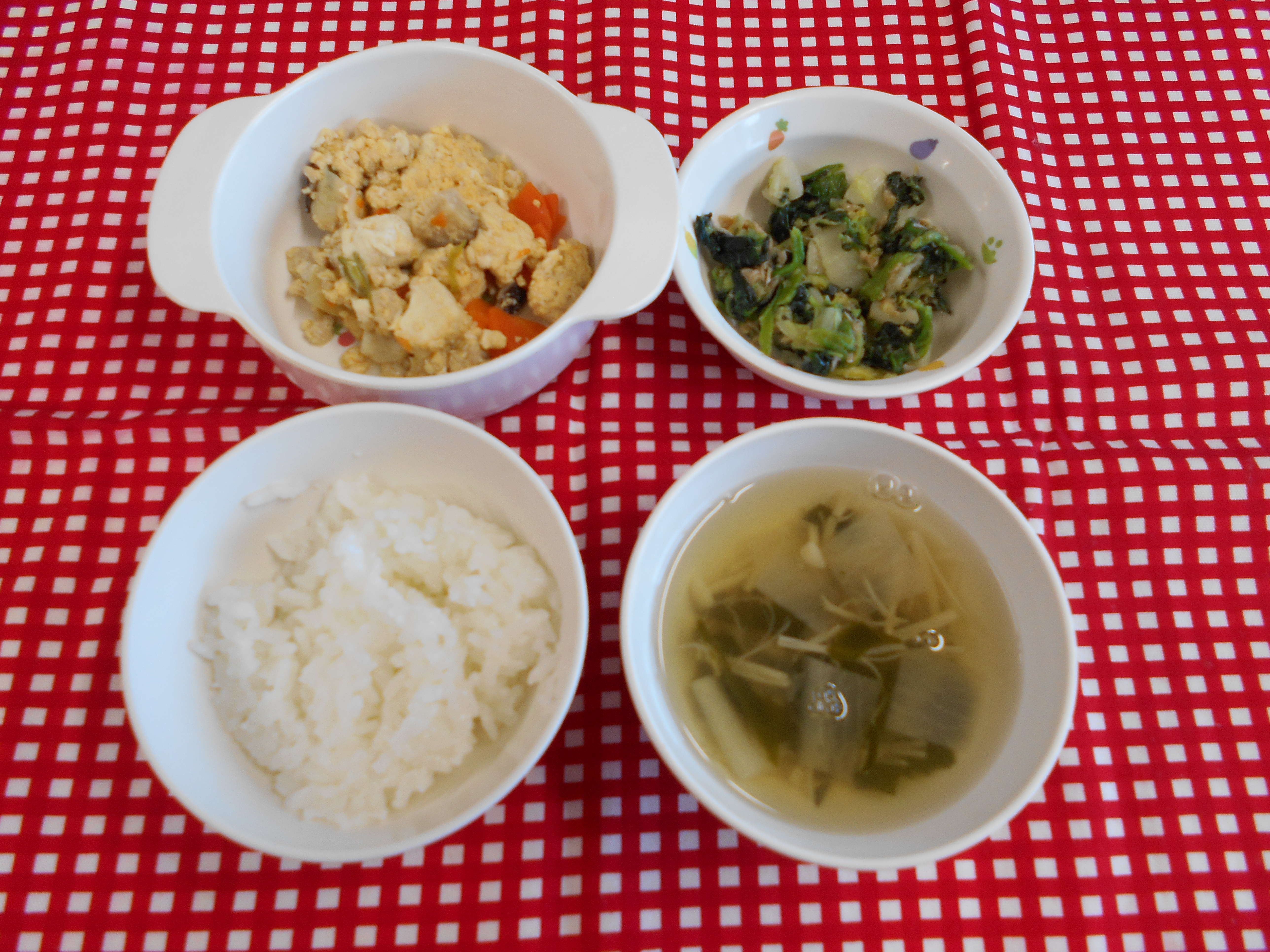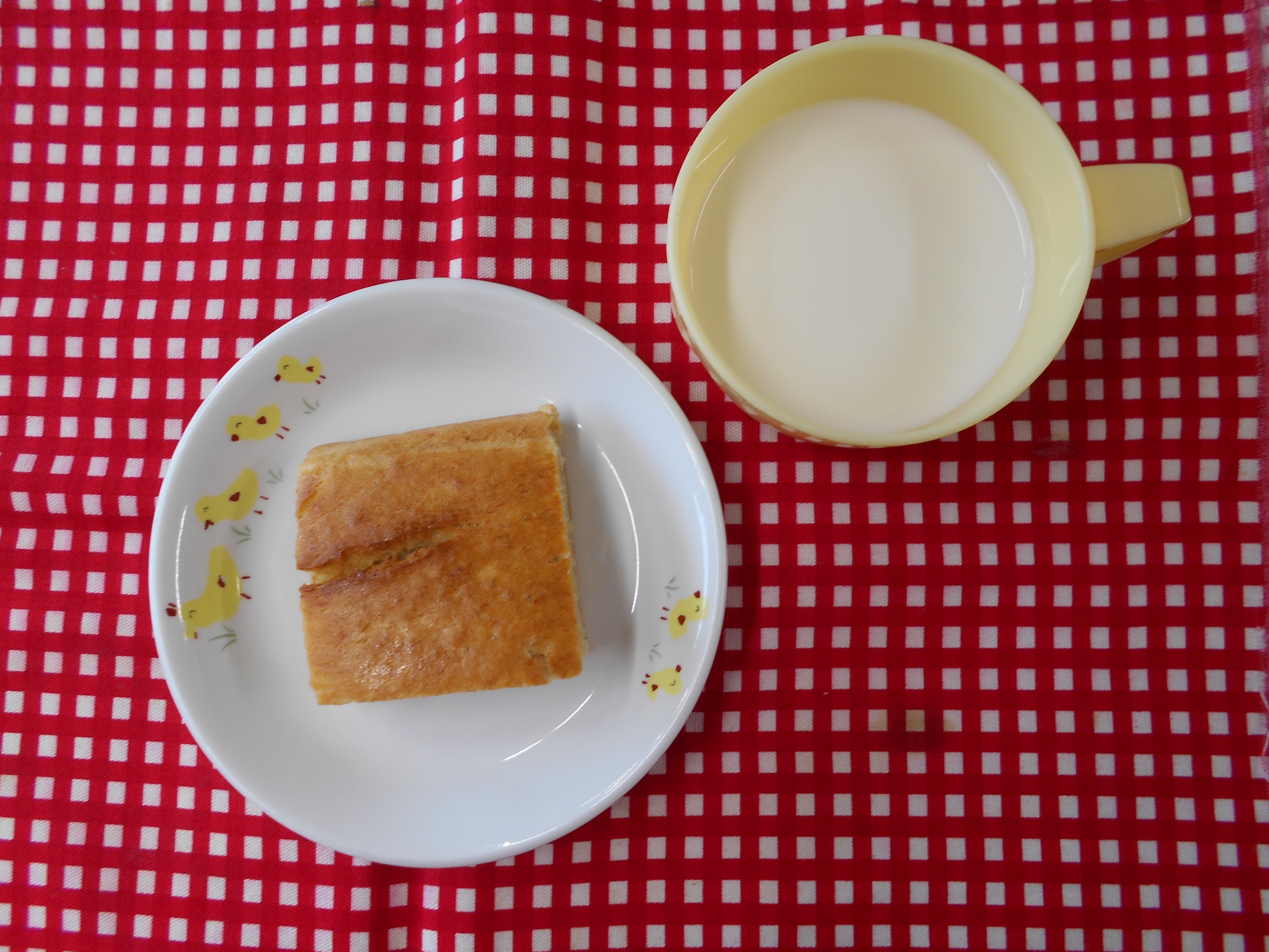 未満児さん10時のおやつ(牛乳、みかん缶) 昼食(炒り豆腐、ほうれん草のツナ和え、大根のすまし汁) おやつ(牛乳、バナナケーキ)