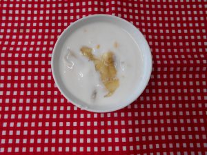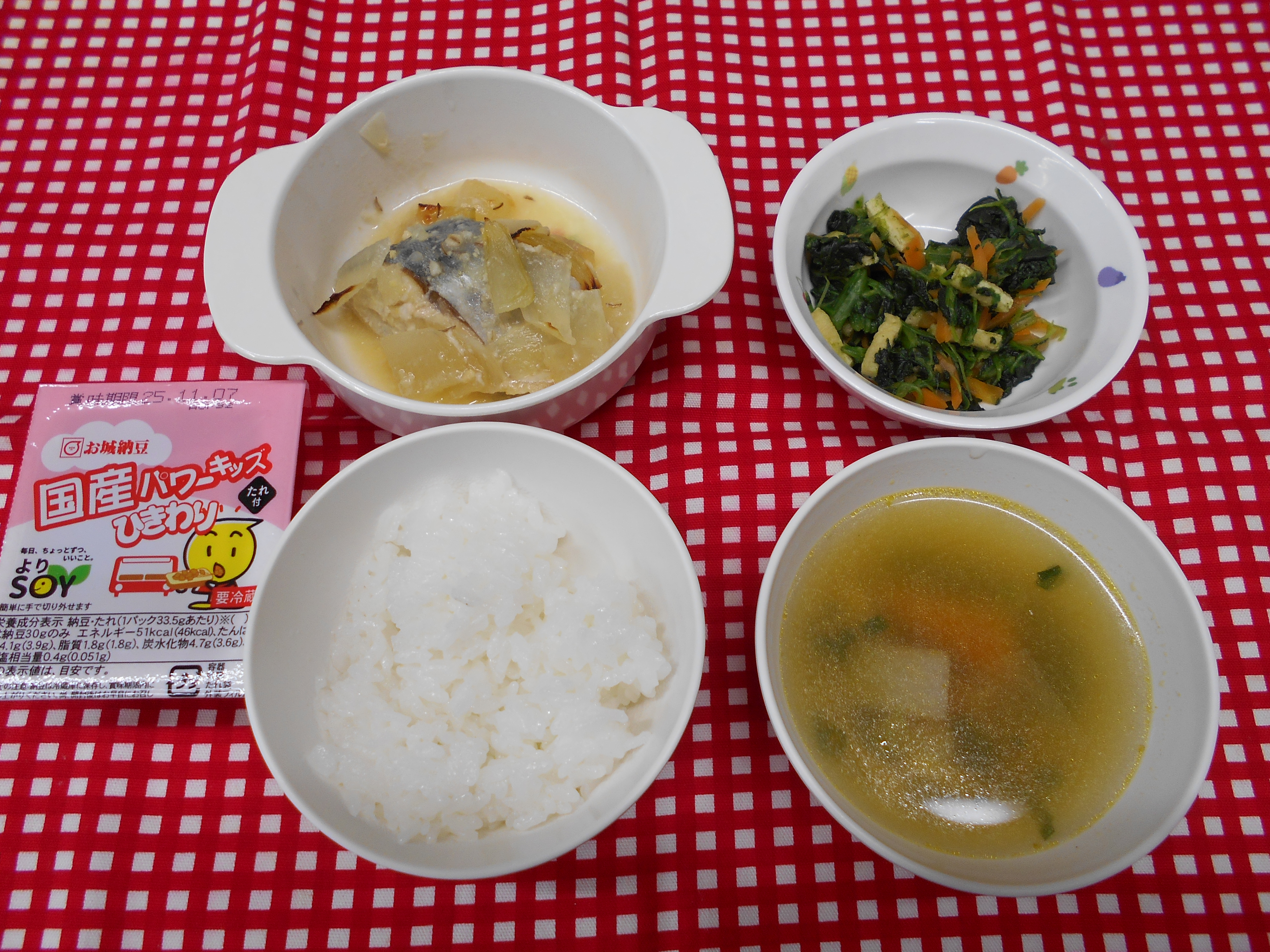 未満児さん10時のおやつ(牛乳、クッキー) 昼食(さばと玉ねぎのみそ煮、ほうれん草と油揚げのお浸し、五目汁、納豆) おやつ(フルーツヨーグルト)