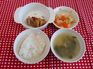 昼食(鶏肉のカレー焼き、大根とあげの煮物、小松菜のみそ汁)
