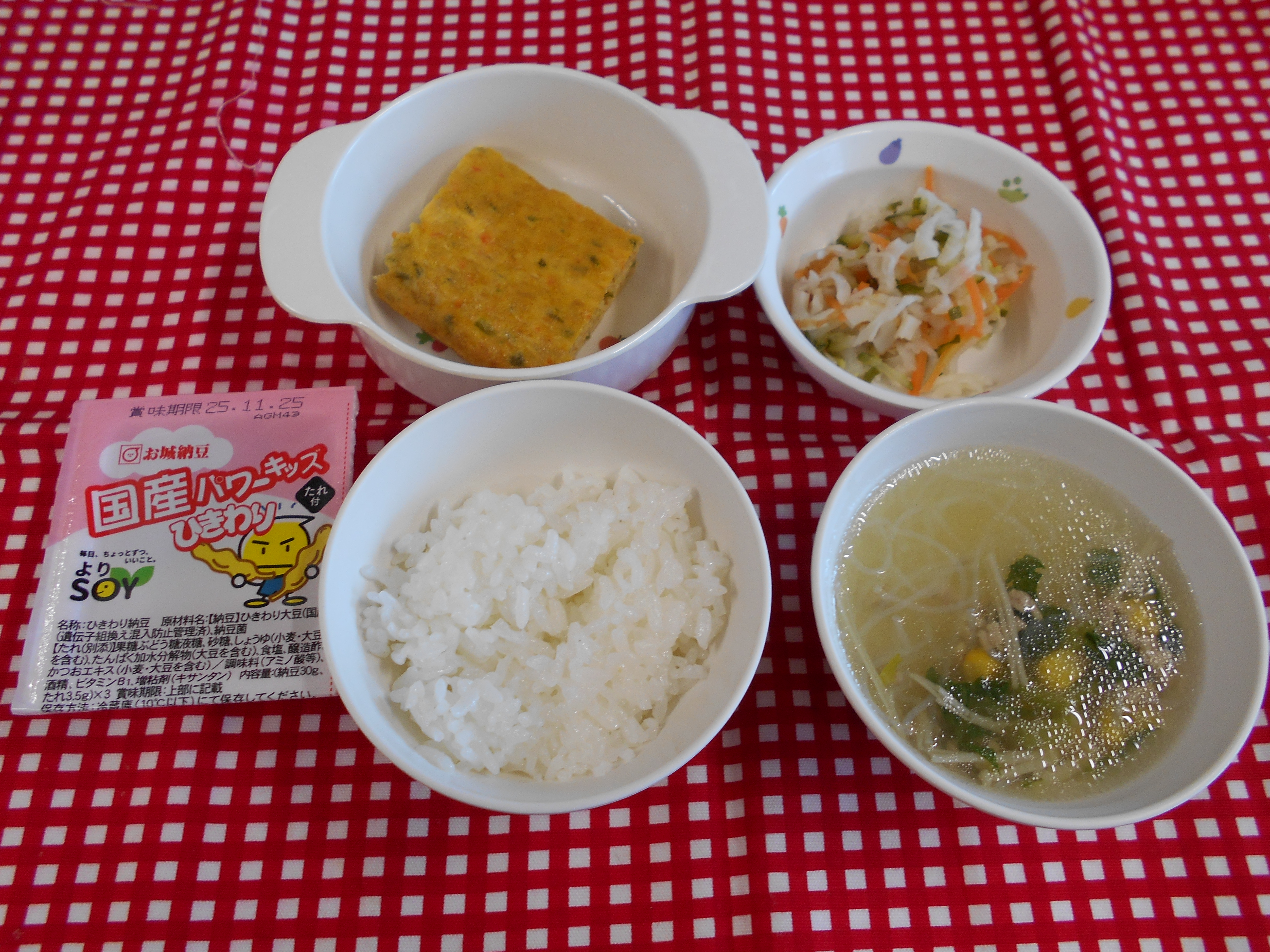 昼食(ツナオムレツ、切干大根のサラダ、はるさめスープ、納豆)