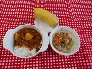 昼食(ハヤシライス、キャベツのゆかり和え、バナナ)