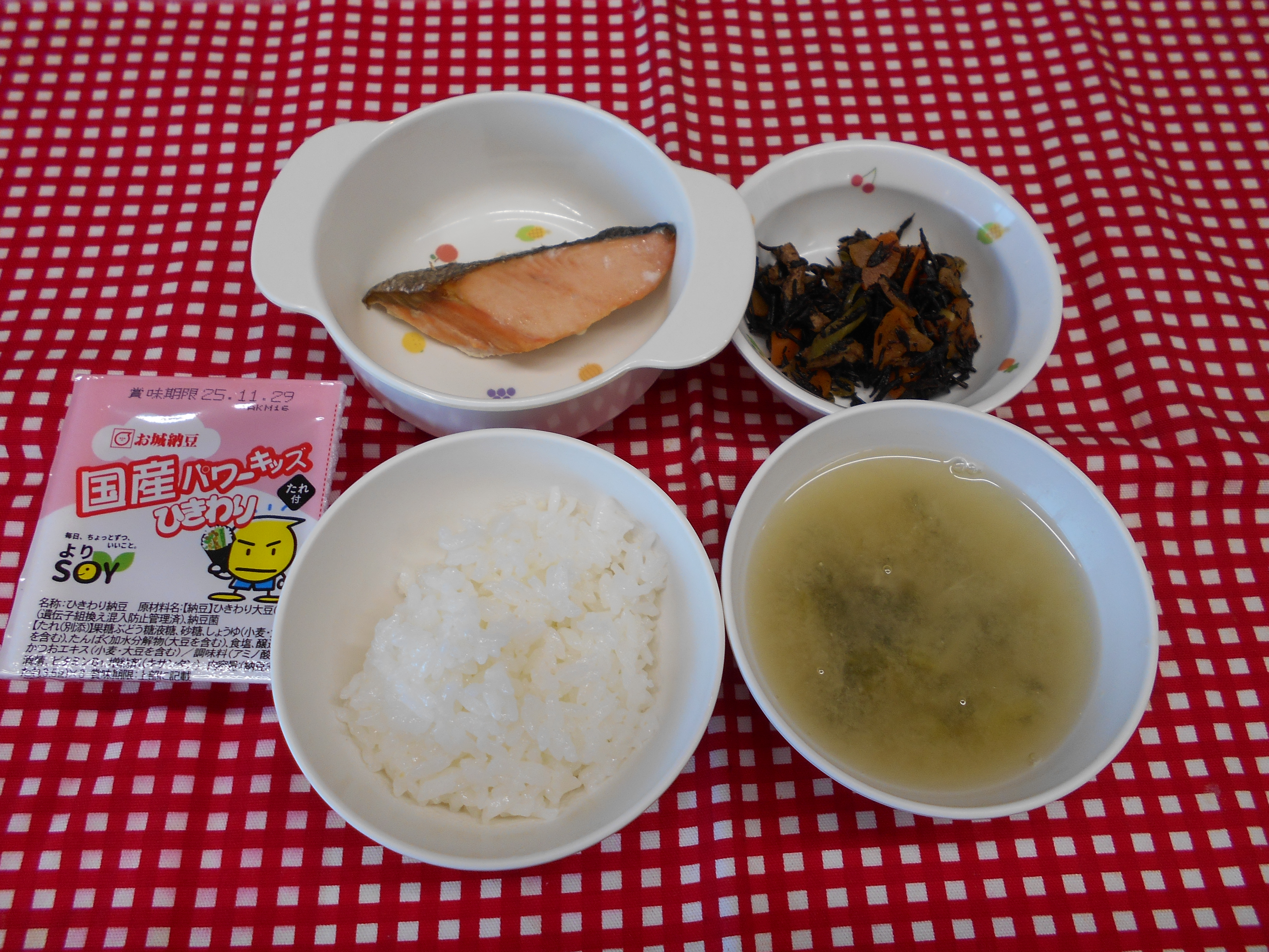 昼食(さけの塩焼き、ひじきの煮物、チンゲン菜のみそ汁、納豆)