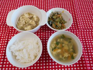 昼食(マーボー豆腐、きゅうりの酢の物、たまごスープ)